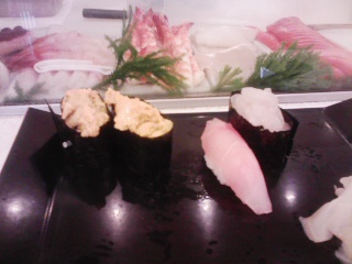 写真は、ウニ軍艦、金目鯛と白海老。お好みで、これ以外には穴子と白魚を注文。
