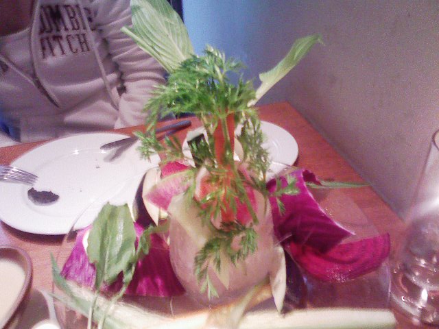 バーニャカウダは初めて。見た目もすばらしい。スティックサラダをコンロで温めたオリーブオイルやチーズの入ったソースにディップして食べる感じなのだけど、ソースが美味しいこと! そして野菜も味わい深いこと……とうもろこしの若いのなどは、ヤングコーンというかベビーコーンの部分だけでなく、ひげ根まで美味しく食べた。