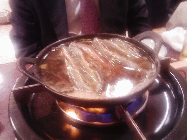 写真は写りがよくないけど、どぜう鍋、通称"丸"。すでに骨まで柔らかく食べられるように下拵えしてあるどじょうを、山ほどのネギと一緒に割り下でさっと煮て食べる。