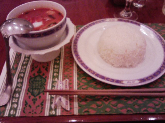 次にレッドカレー。ライスはタイ米、カレーも日本人向けにアレンジしていないとのことで結構辛かった(ココナッツがたっぷり入っているのでマイルドではあるのだが)。