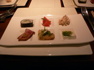 この後、寒ブリのカルパッチョ、ジャガイモのポタージュ柚子山椒の香り、ハーブブレッド、サーモンのイクラ添え、細うどんの○○ソース柚子胡椒添え、グリーンサラダオニオンドレッシング、牛肉スライスの巻きステーキ野菜添え、一口カレーライス、コーヒー風味のブラマンジェとコーヒーまたは紅茶(以上、皿の名称は写真を見て適当に自分がつけた^_^;)と続いた。3,800円のコースとしては、品数も多く、一品一品の質が高かった……美味しかった。