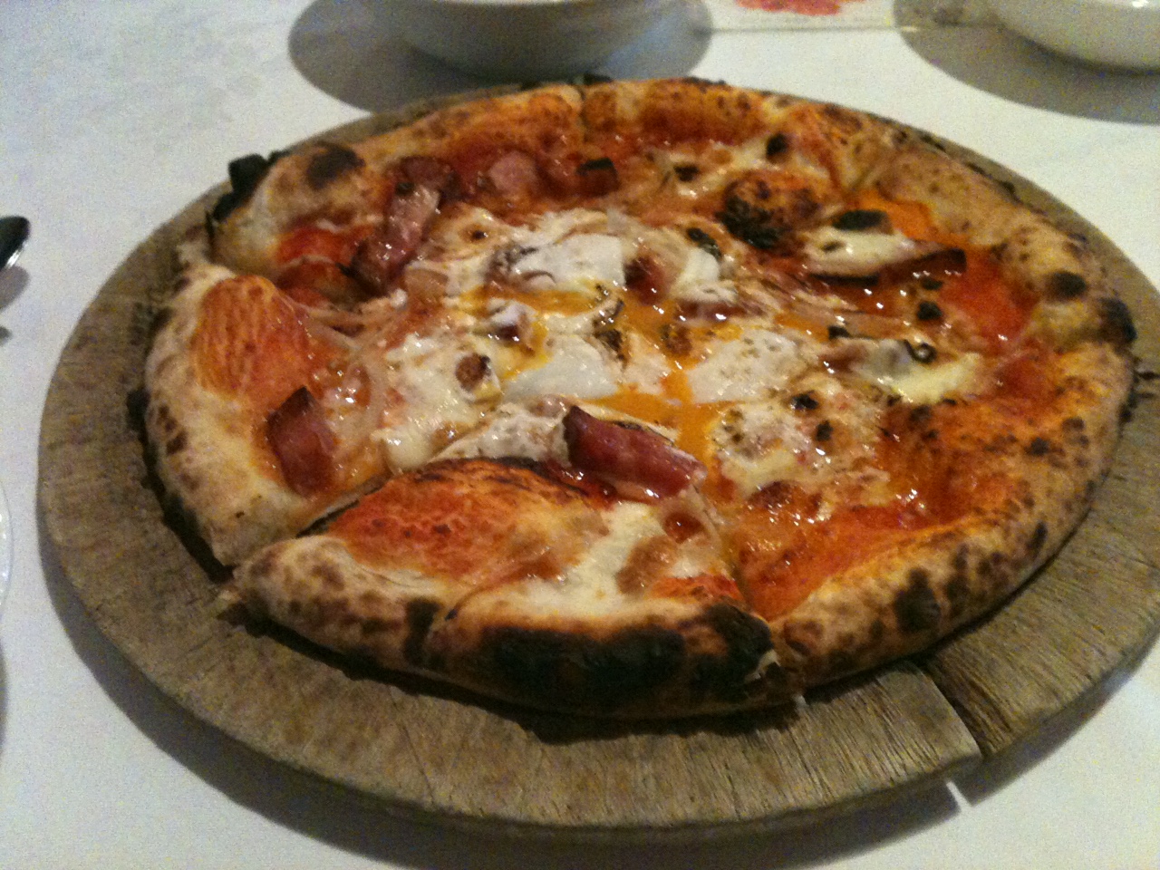 これは仲間が頼んだ卵とベーコンのピザ。自分はマルゲリータを注文。薄焼きクラストの味がイタリアンっぽくてよかった。