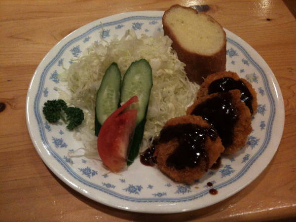 ミニひれかつ590円。これはお得感たっぷり。「ミニ」なのにひれかつが3切れ! サラダとパン(通常は丸いロールだが、フランスパンに変更できる。フランスパンにしてみた)がついてて、コメダオリジナルのドレッシング(フレンチ風の白いのと、和風ドレッシングのボトル2本がセットされた金属製のホルダーで出てくるので、たっぷり使用できる)。