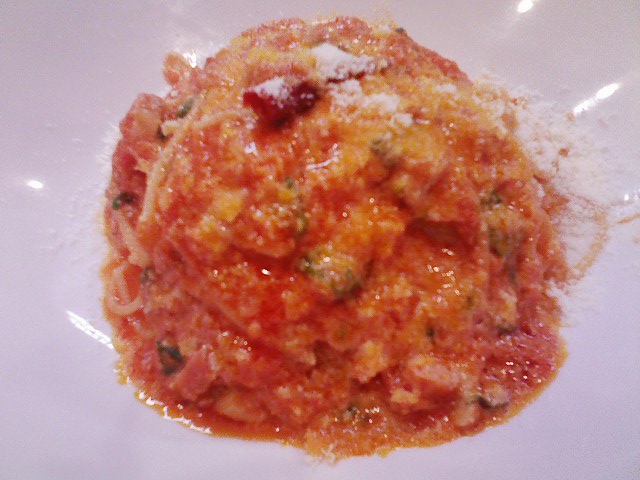 盛りがたっぷり、チーズがたっぷりまぶされているので、見た目、トマトクリームソースのようになっている(苦笑)。