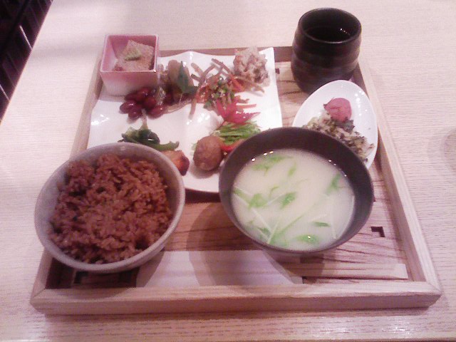 鮭、小さなつくねの焼き鶏、ゴボウとニンジンのきんぴらなど一口ずつ品数の多いランチプレート(定食だな^_^;)を楽しんだ。分量は、やや少食の自分にはちょうどいい。がっつり食べたいという女性には、物足りないだろう……デザートを別注文できるように少なめにしているのかな(笑)。